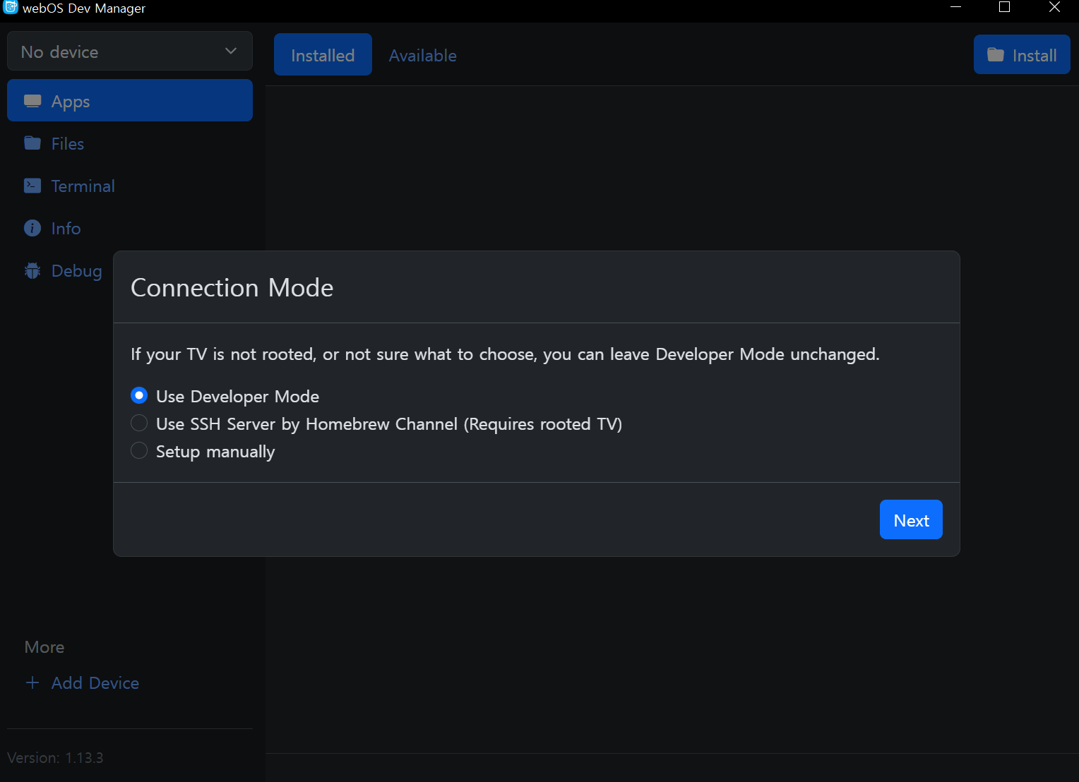 - Address : TV의 Developer Mode 앱에 있는 IP Address를 적어줍니다 (두 개 있는데 하나는 유선 하나는 무선이므로 숫자 적힌 거 적어주시면 됩니다.)