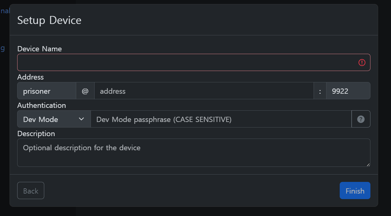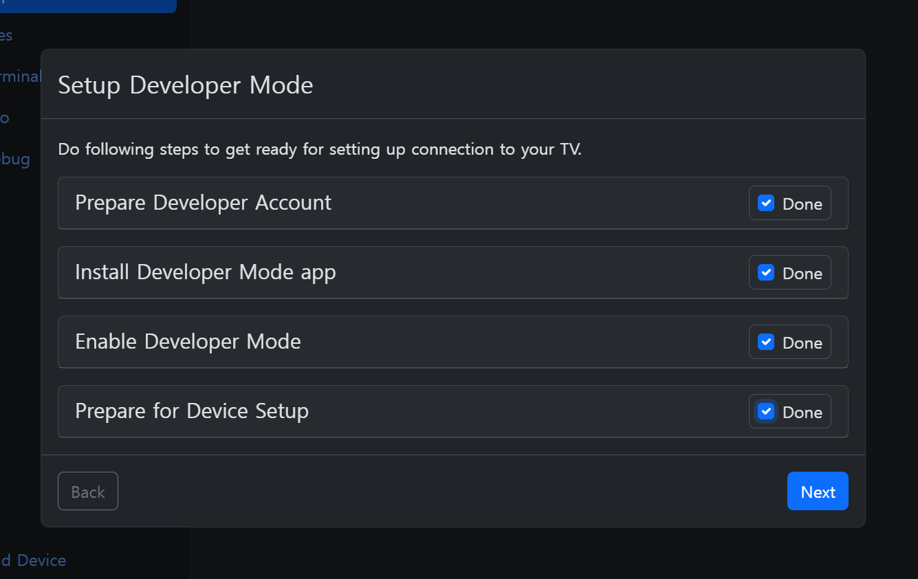 - Authentication : TV의 Developer Mode에 있는 Passphrase를 적어줍니다. Finish를 누릅니다.