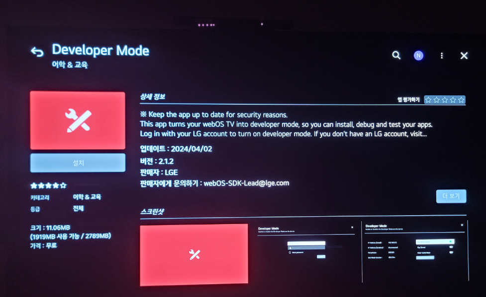 weoOS 4.0 이상에서만 설치된다는 얘기가 있습니다.